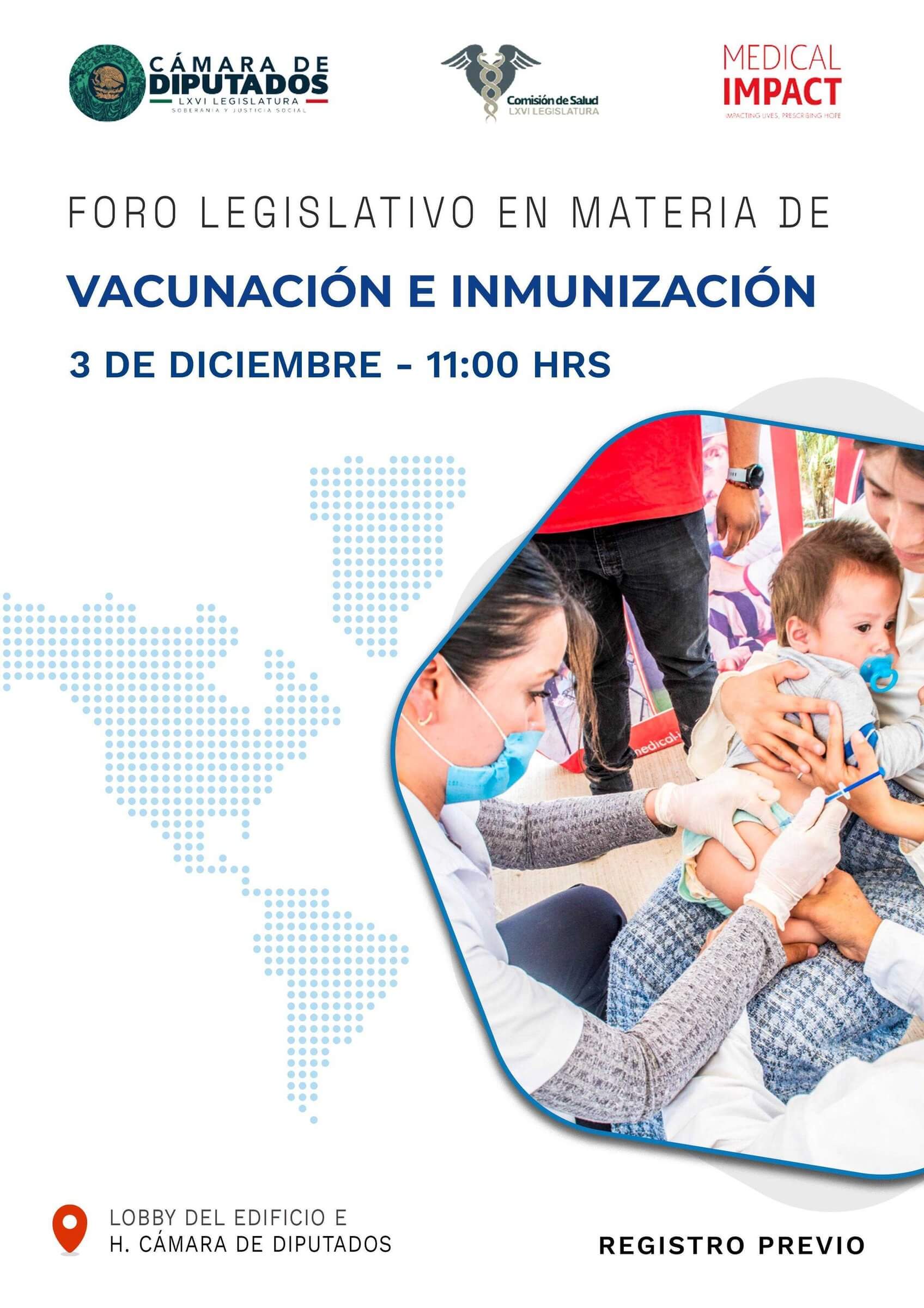 El Foro Legislativo de Vacunación e Inmunización se llevará a cabo el 3 de diciembre de 2025, a las 11:00 hrs, en el Lobby del Edificio E de la H. Cámara de Diputados en Ciudad de México. Este evento tiene como finalidad fortalecer el Programa de Vacunación Universal (PVU) y la implementación de un Registro Nominal de Vacunación e Inmunización en el país.